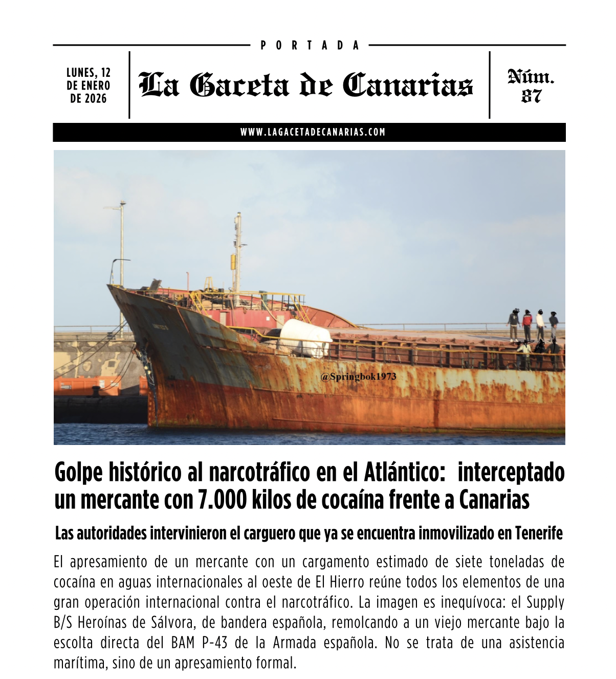 Ya está disponible la portada de La Gaceta de Canarias para este lunes 12 de enero de 2026. Puedes descargarla aquí.Portada La Gaceta de Canarias Portada La Gaceta de Canarias 1
