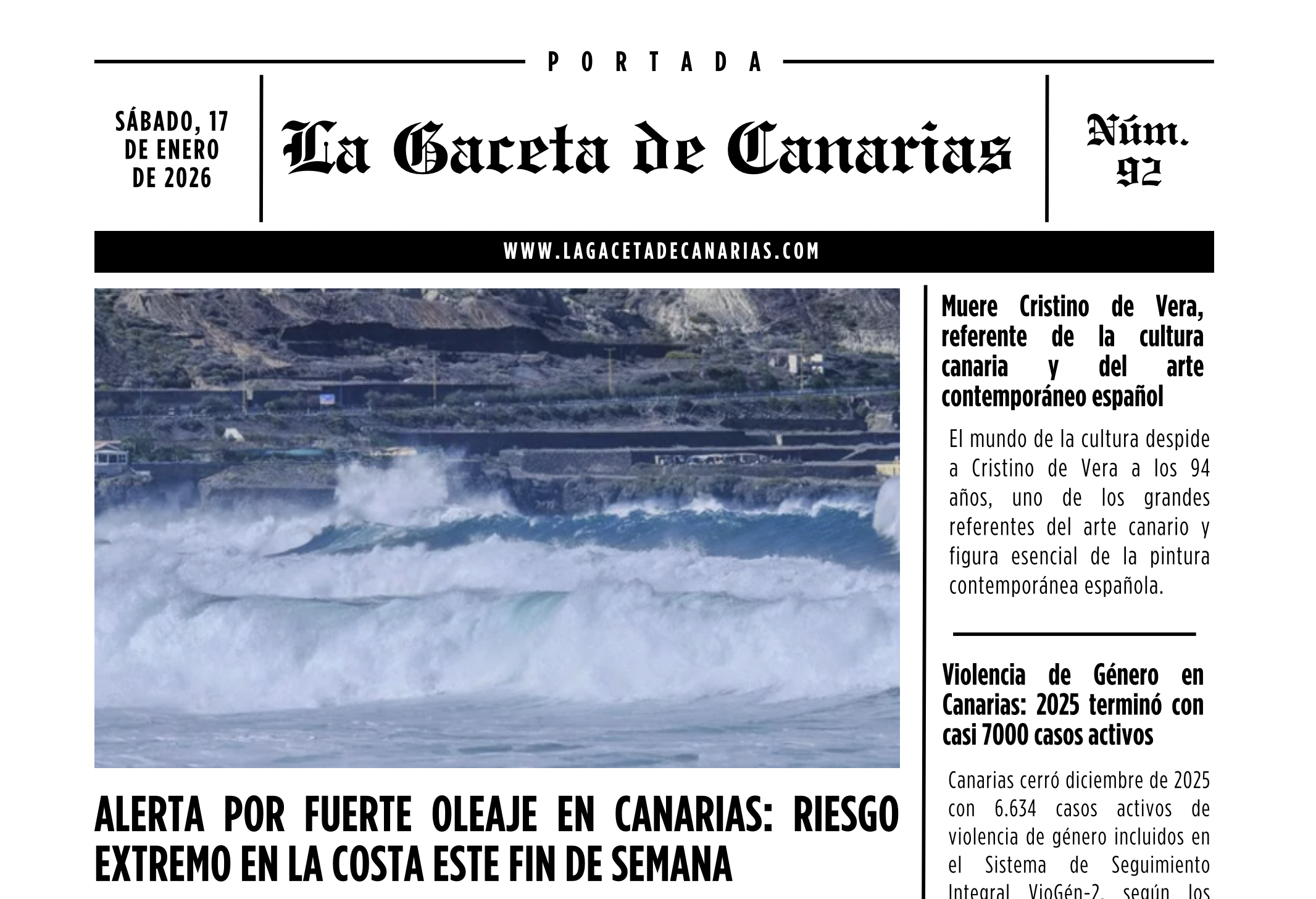 Ya está disponible la portada de La Gaceta de Canarias para este sábado, 17 de enero de 2026. Puedes descargarla aquí.Portada La Gaceta de Canarias (3)