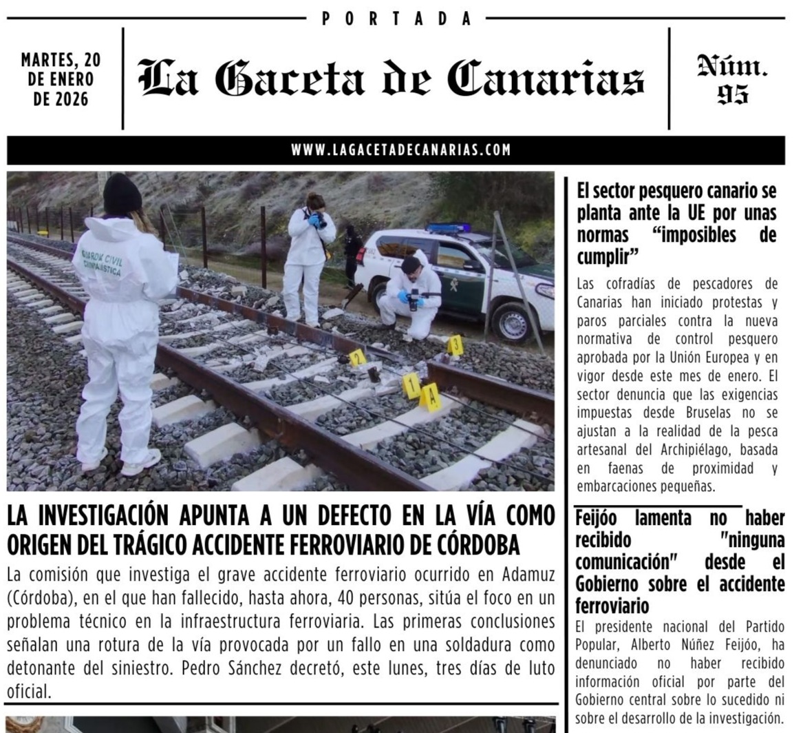 Ya está disponible la portada de La Gaceta de Canarias para este martes, 20 de enero de 2026. Puedes descargarla aquí.