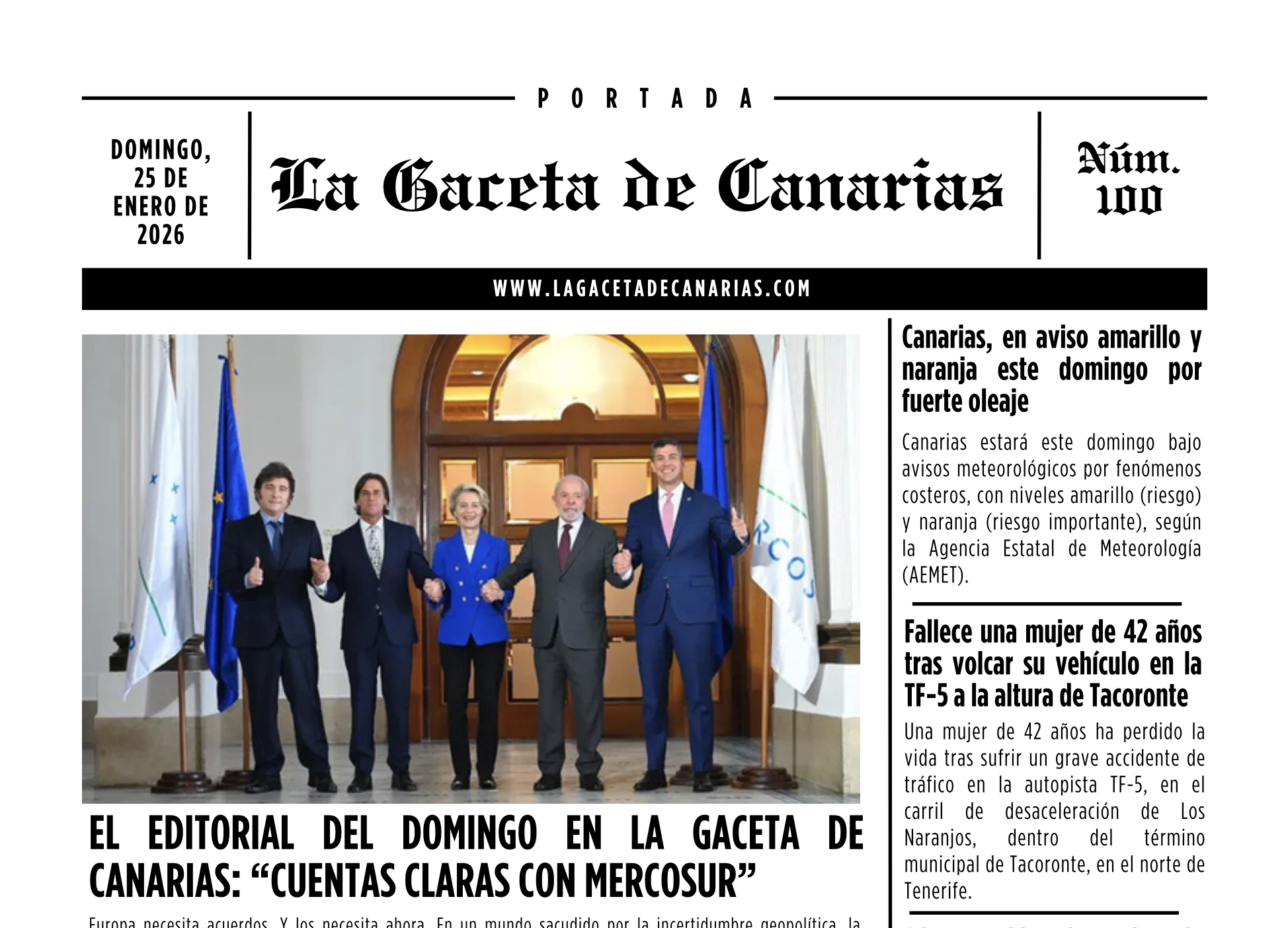 Ya está disponible la portada de La Gaceta de Canarias para este domingo, 25 de enero de 2026. Puedes descargarla aquí. Portada La Gaceta domingo 25 de enero