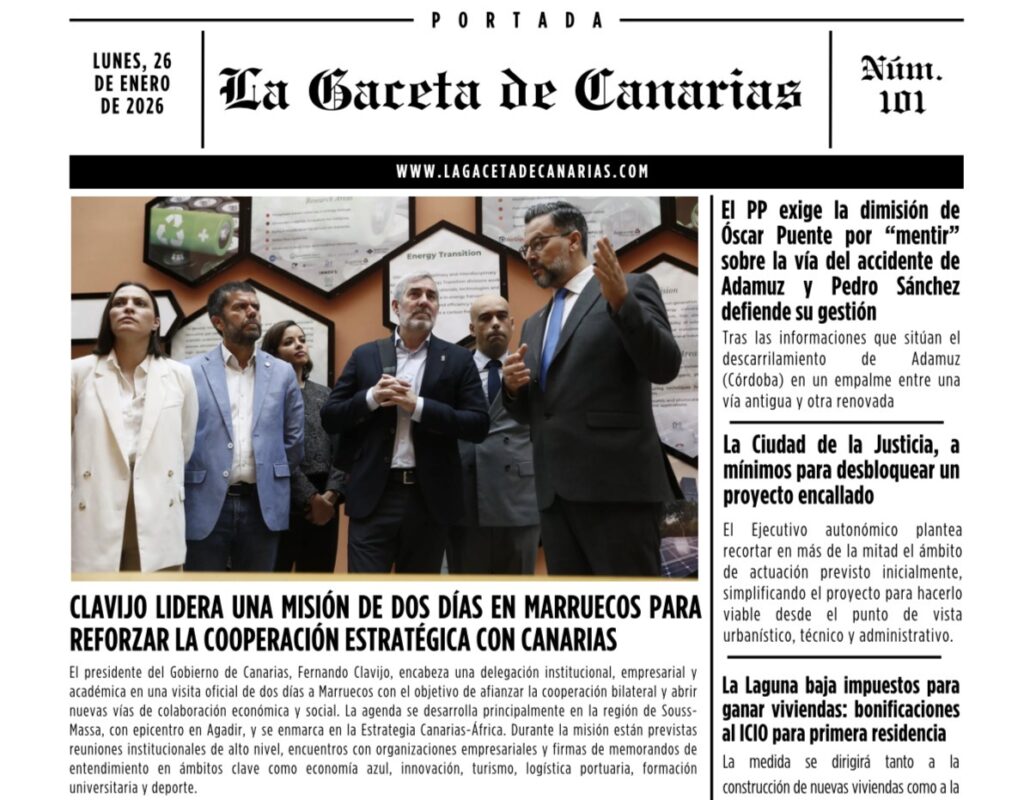 Ya está disponible la portada de La Gaceta de Canarias para este lunes 26 de enero. Descárgala aquí. La Gaceta 26-01-2026