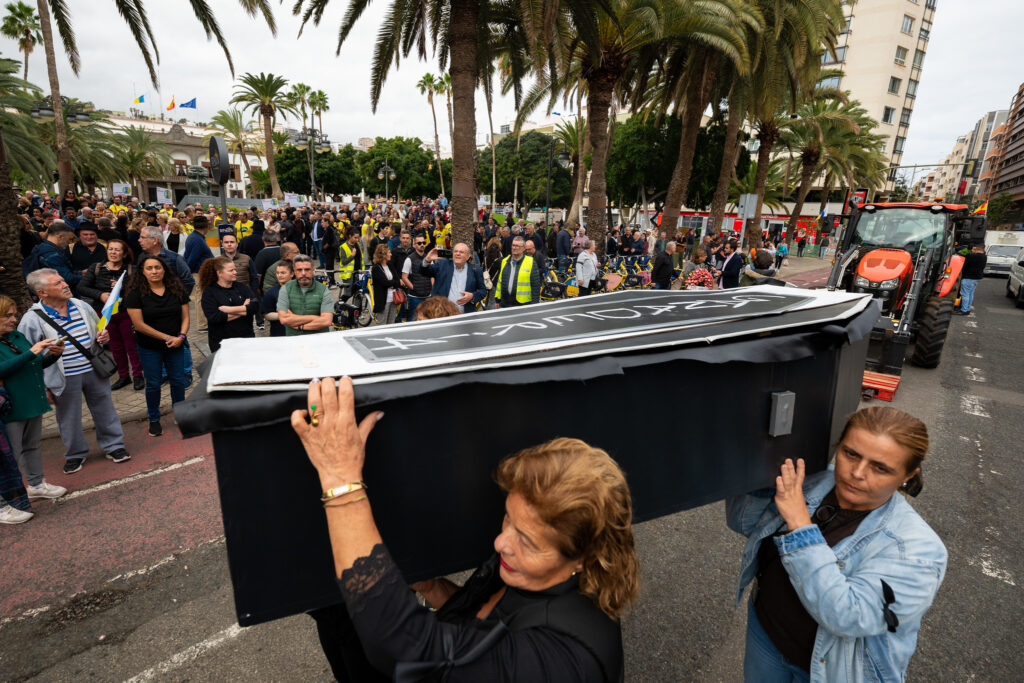 El sector primario canario protagonizó este jueves una protesta tan simbólica como contundente para alertar de la situación crítica que atraviesan la agricultura, la ganadería y la pesca en las Islas. Ataúdes, pancartas y mensajes directos sirvieron para visualizar lo que los profesionales del campo consideran una muerte anunciada si no se corrige el rumbo […]