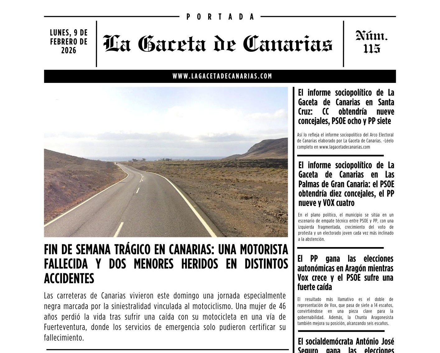 Ya está disponible la portada de La Gaceta de Canarias para este lunes, 9 de febrero de 2026. Puedes descargarla aquí. Portada La Gaceta de Canarias 09-02-2026