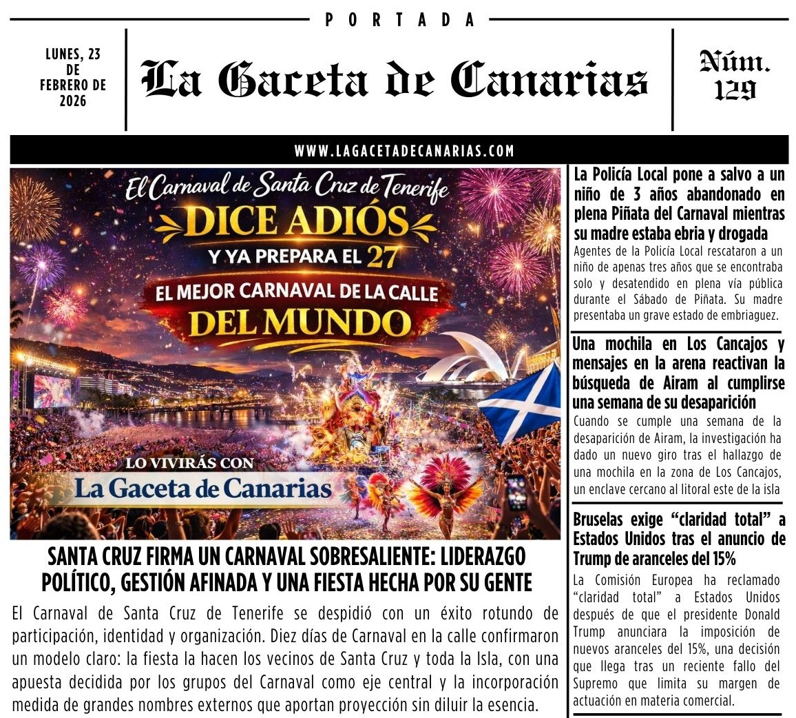 Ya puedes leer la portada de La Gaceta de Canarias para este lunes, 23 de febrero de 2026. Descárgala aquí La Gaceta de Canarias 23-02-2026