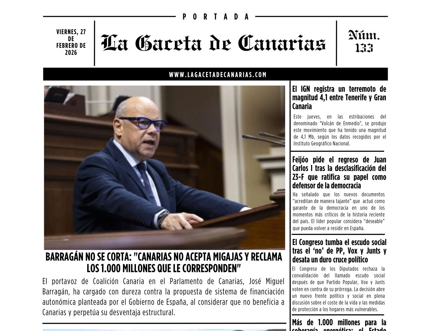 Ya puedes leer la portada de La Gaceta de Canarias para este jueves 26 de febrero. Puedes descargarla aquí. Portada La Gaceta de 27-02-2026