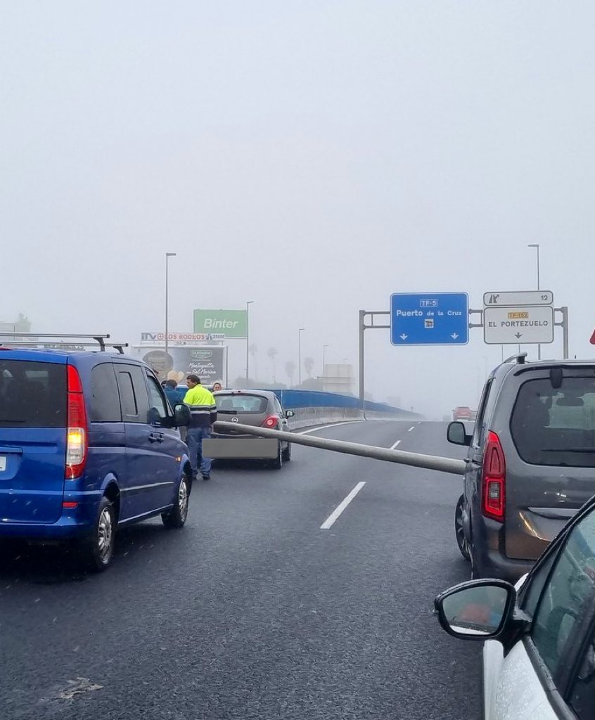 Los fuertes vientos provocan la caída de una farola sobre un vehículo en plena autopista TF-5