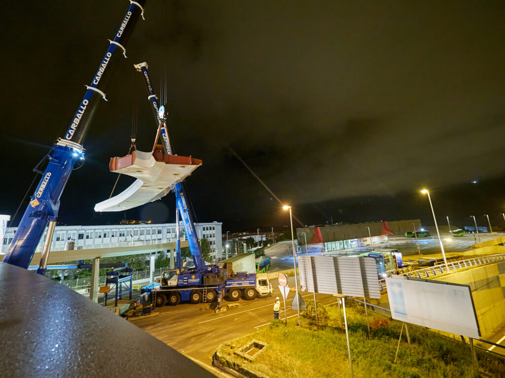 El Cabildo de Tenerife continúa avanzando en las obras del Gran Anillo Peatonal de la glorieta de Padre Anchieta con la colocación de una nueva pieza estructural durante la noche de este lunes. La estructura instalada corresponde a la pieza número 22 del conjunto y tiene unas dimensiones de 25 metros de longitud y un peso aproximado de 50 toneladas. Este elemento permitirá conectar el ascensor con la pasarela y la escalera que dará acceso al Intercambiador de Transportes de La Laguna. Con su colocación, quedan únicamente tres piezas pendientes para completar la pasarela peatonal.