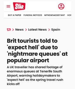 El aeropuerto de Tenerife Sur vuelve a saltar al foco internacional tras una publicación del diario británico Daily Star, que advierte a los turistas de que se “preparen para un infierno” debido a las largas colas en los controles de pasaportes.