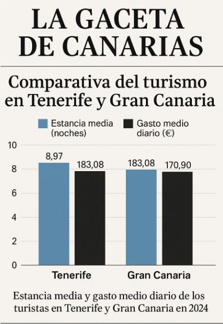 Tenerife y Gran Canaria, las dos islas con mayor peso en el PIB turístico regional, muestran en 2024 una evolución dispar: mientras Tenerife incrementa su gasto medio diario por visitante, Gran Canaria mantiene una estancia media superior, reflejando dos modelos de consumo turístico complementarios.