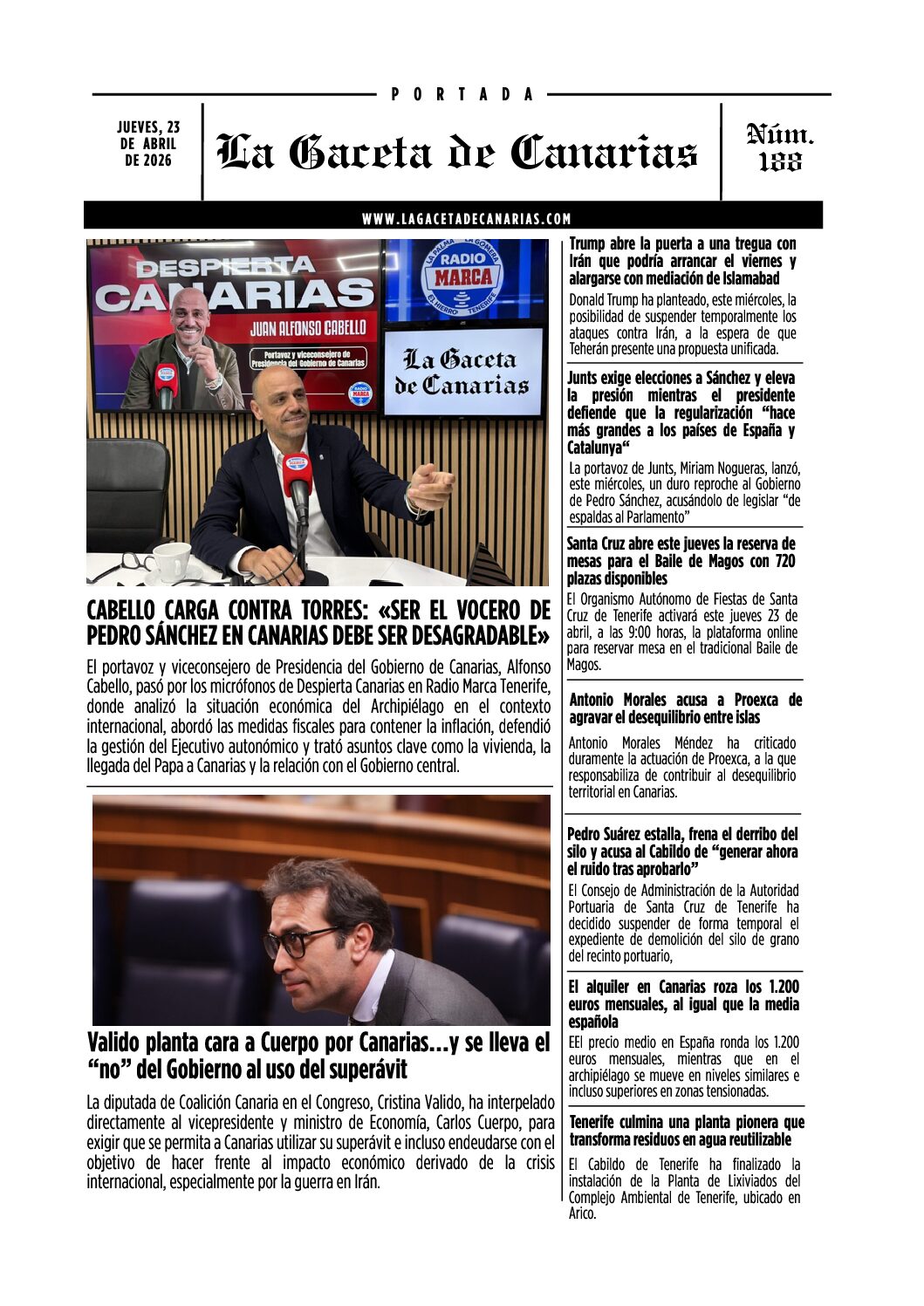 Ya está disponible la portada de La Gaceta de Canarias para este jueves 26 de abril. Portada de La Gaceta de Canarias del jueves 23 de abril