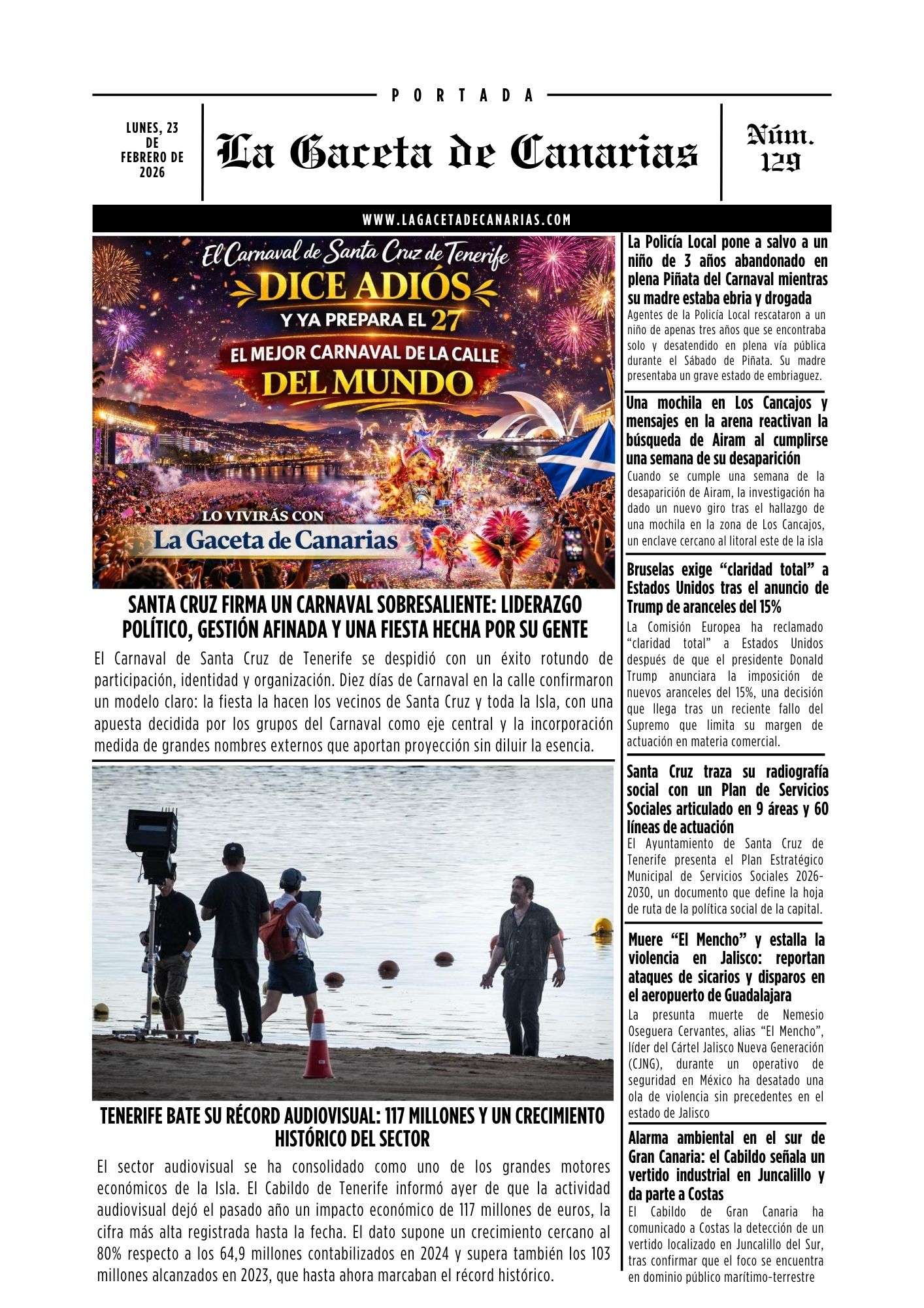 Ya puedes leer la portada de La Gaceta de Canarias para este lunes, 23 de febrero de 2026.