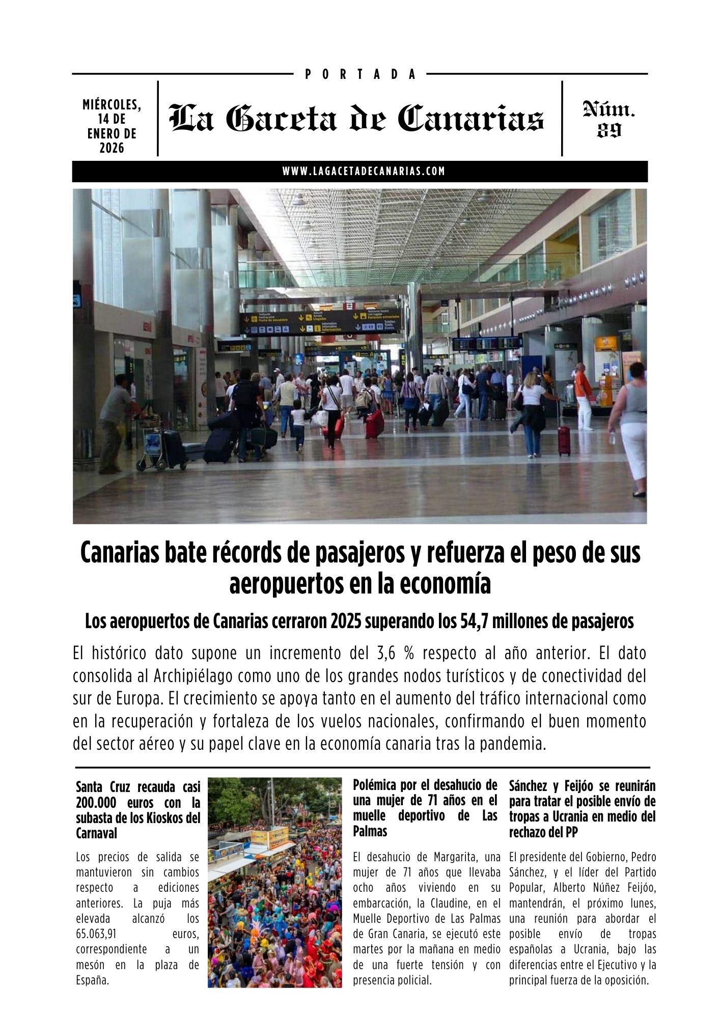 Ya está disponible la portada de La Gaceta de Canarias para este miércoles, 14 de enero de 2026.