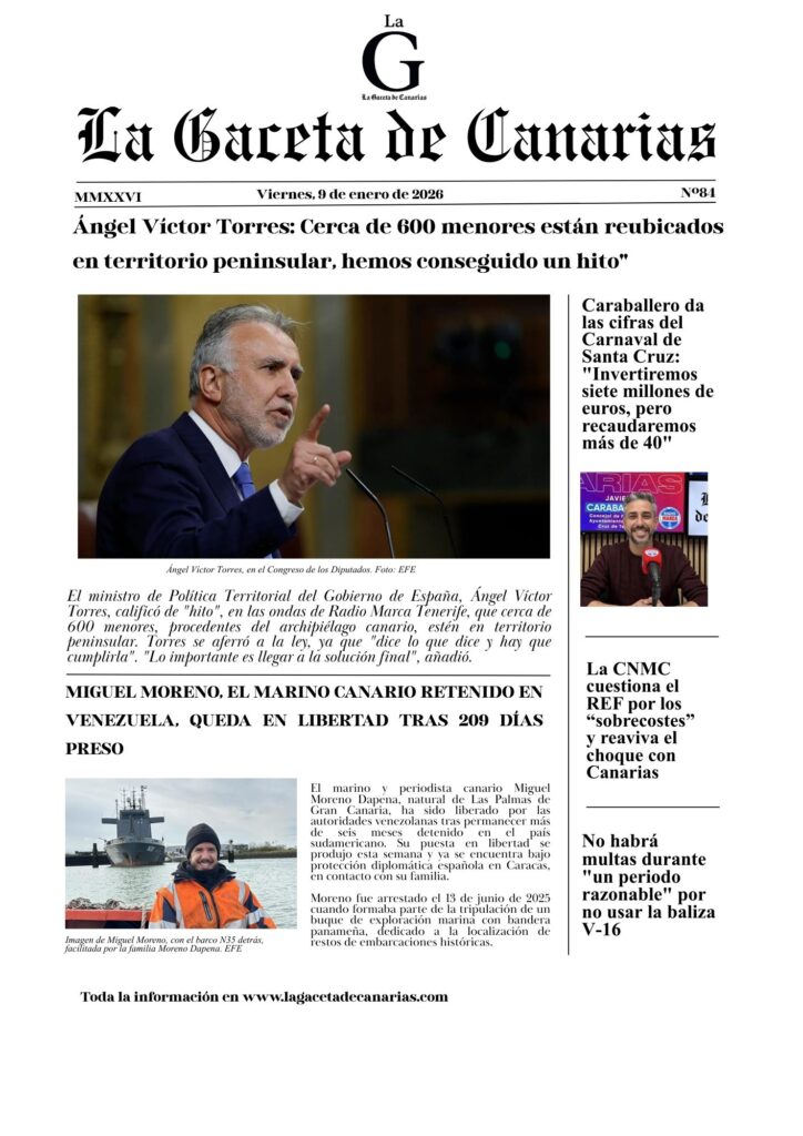 Ya está disponible la portada de La Gaceta de Canarias para este viernes 9 de enero de 2026.