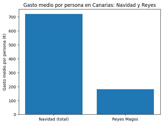 El gráfico muestra el gasto medio por persona en Canarias, diferenciando el conjunto de la Navidad y el peso específico de la campaña de Reyes Magos.