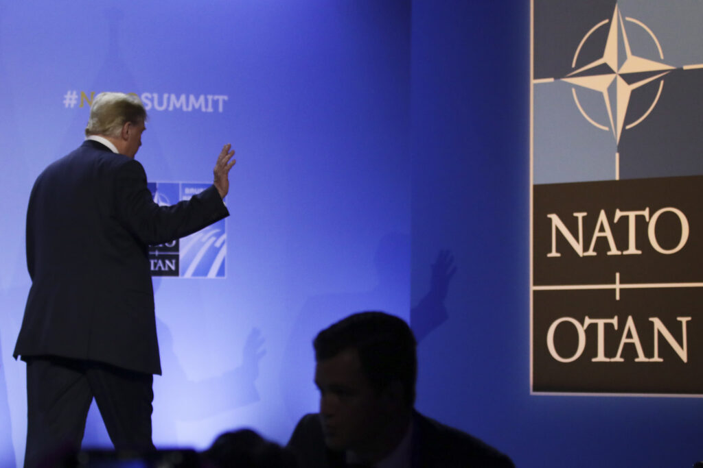 U.S. President Donald Trump leaves after a press conference at the end of a summit of heads of state and government at NATO headquarters in Brussels, Belgium, Thursday, July 12, 2018. NATO leaders gather in Brussels for a two-day summit. (AP Photo/Olivier Matthys)