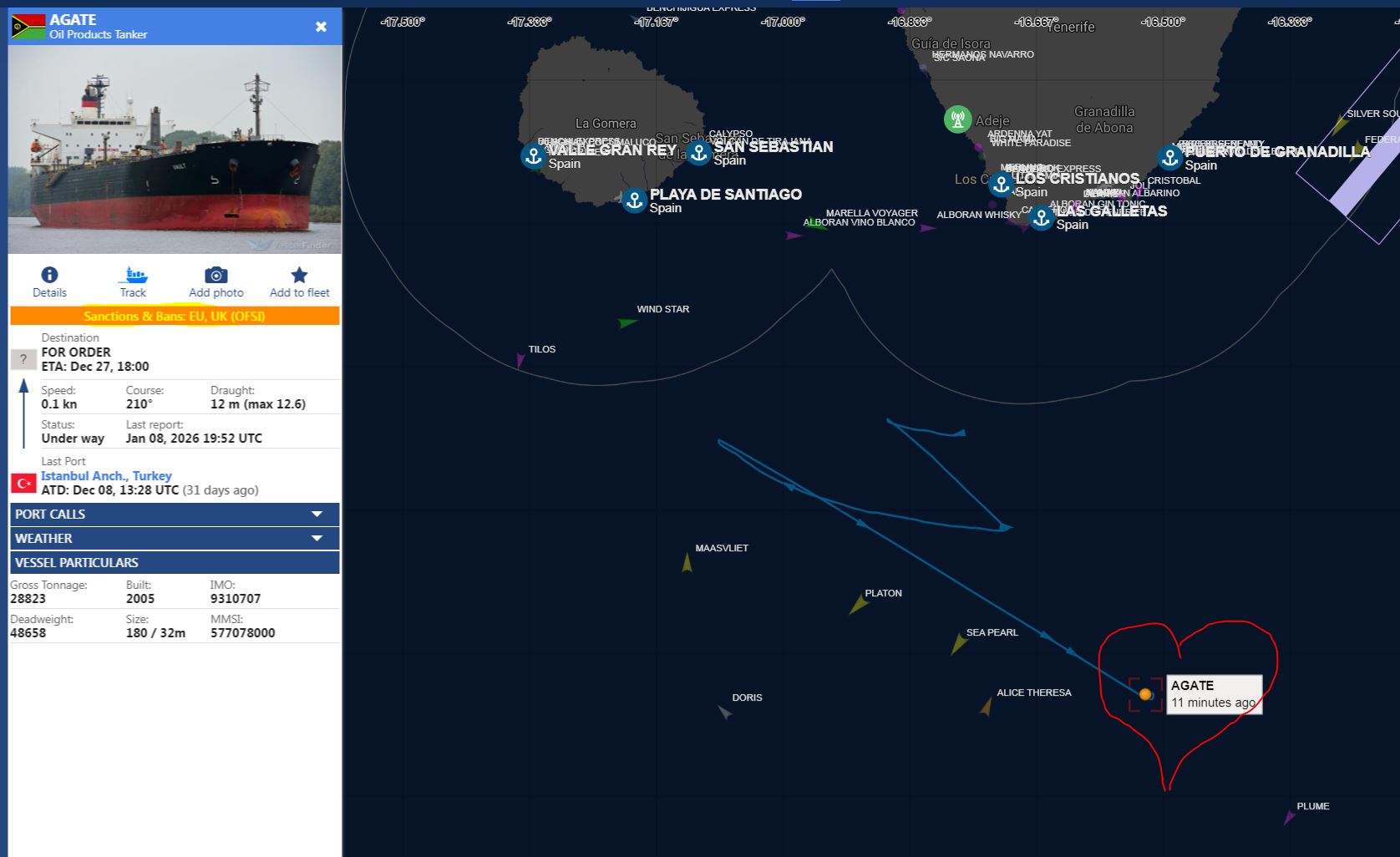 El Agate está registrado en Vanuatu, un sitio como Canarias pero con las playas aún sin destruir ni contaminar por un ejercicio de sobrepoblación. Navega bajo una de las banderas de conveniencia más opacas y lo mejor de la carta es que el buque está en la lista de las sanciones de la Union Europa y el Reino Unido (OFSI).